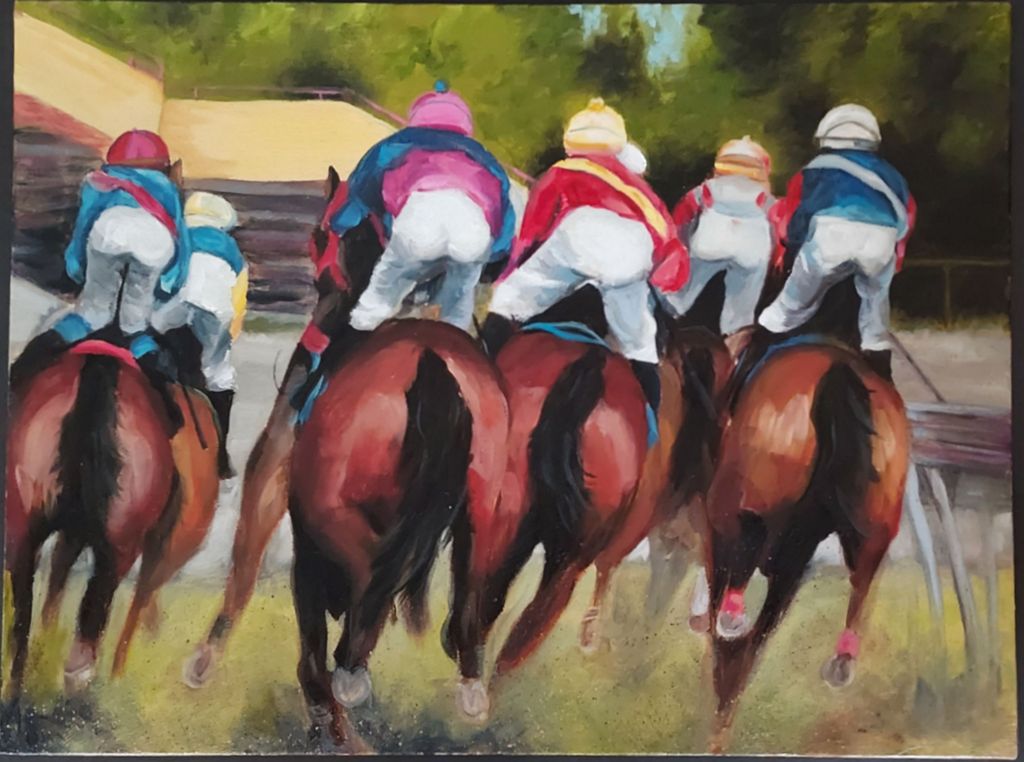 The Rush to Victory $560 Framed (Shipping & Tax Not Included)- Full of rich deep tones, contrast and movement in legs. Published Ocala Gazette Nov 18th, 2025